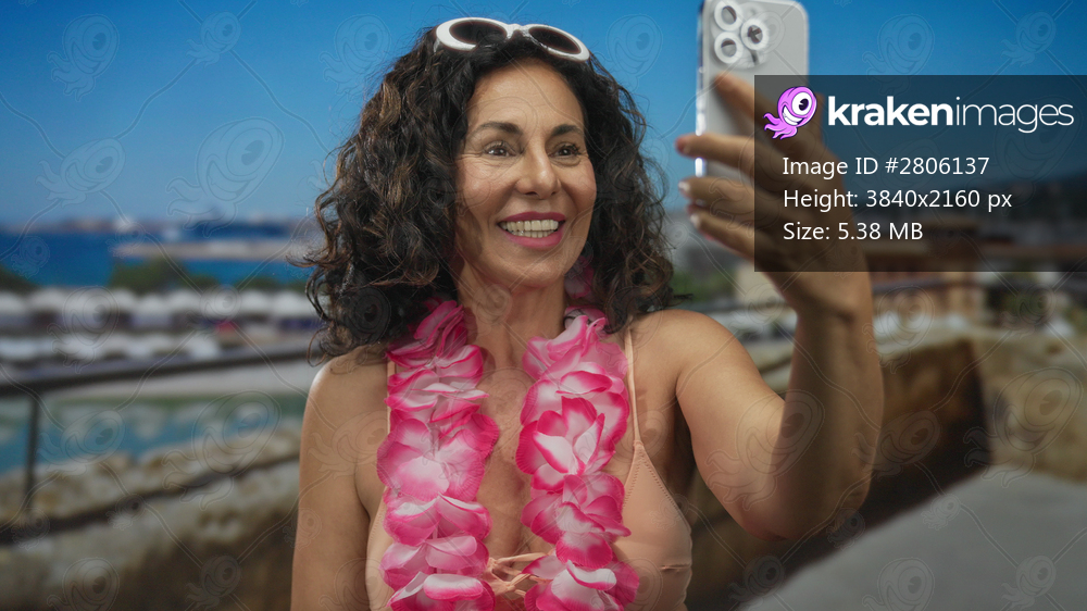 Middle age hispanic woman wearing bikini top and floral lei holds smartphone with outstretched arm for selfie at port; tropical vacation joy relaxation. - Kraken Images