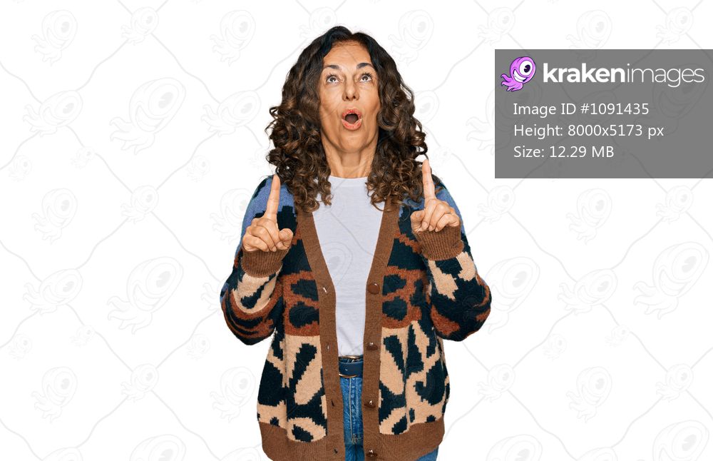 Middle age hispanic woman wearing casual clothes amazed and surprised looking up and pointing with fingers and raised arms.