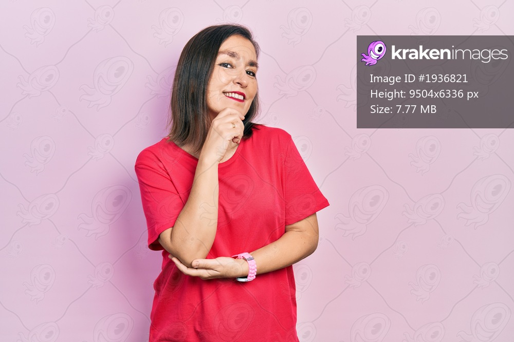 Middle age hispanic woman wearing casual clothes looking confident at the camera smiling with crossed arms and hand raised on chin. thinking positive.