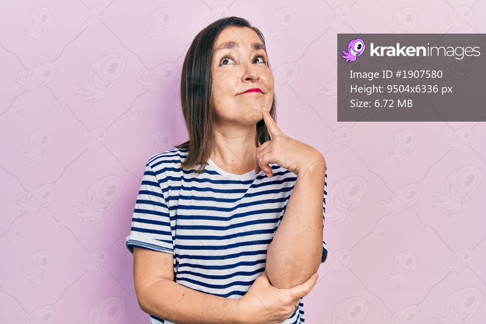 Middle age hispanic woman wearing casual clothes thinking concentrated about doubt with finger on chin and looking up wondering