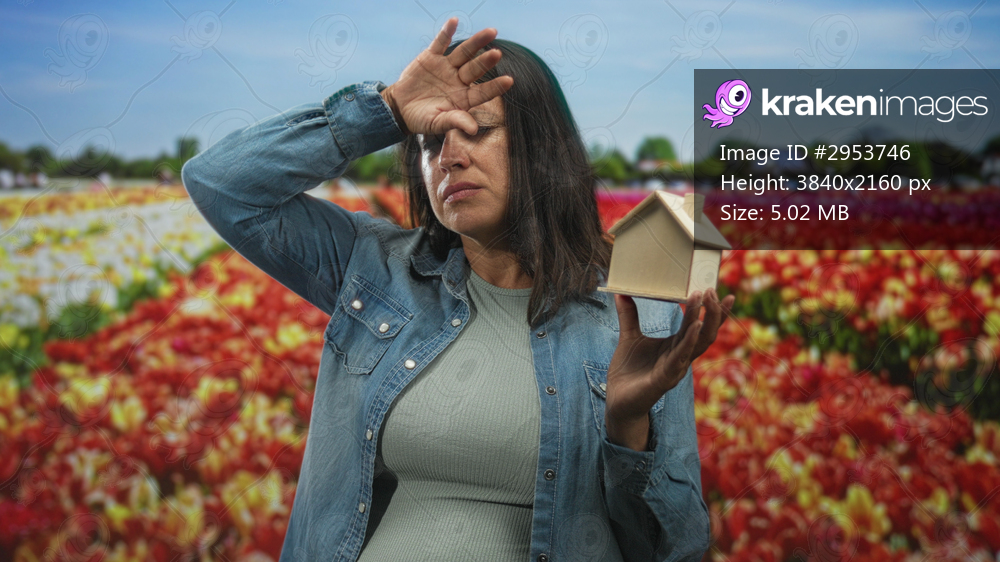 Middle age hispanic woman wearing denim jacket holding small wooden house model, hand on forehead for headache while standing in a tulip field; mortgage anxiety. - Kraken Images
