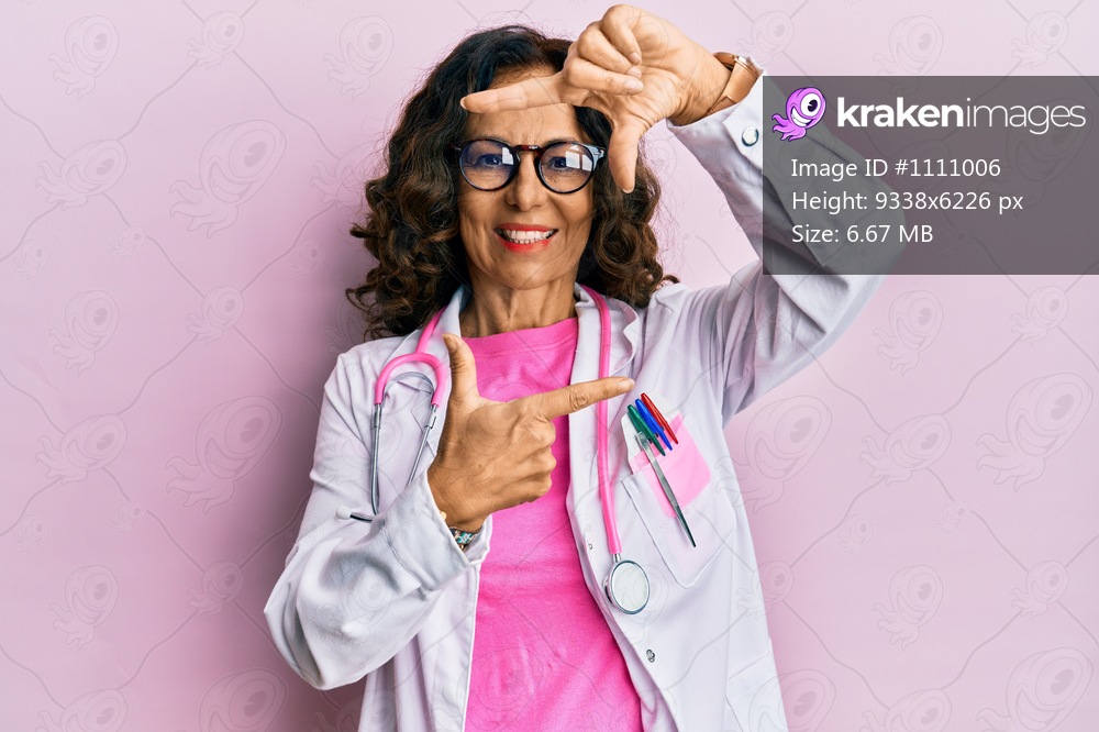 Middle age hispanic woman wearing doctor uniform and glasses smiling making frame with hands and fingers with happy face. creativity and photography concept. - Kraken Images