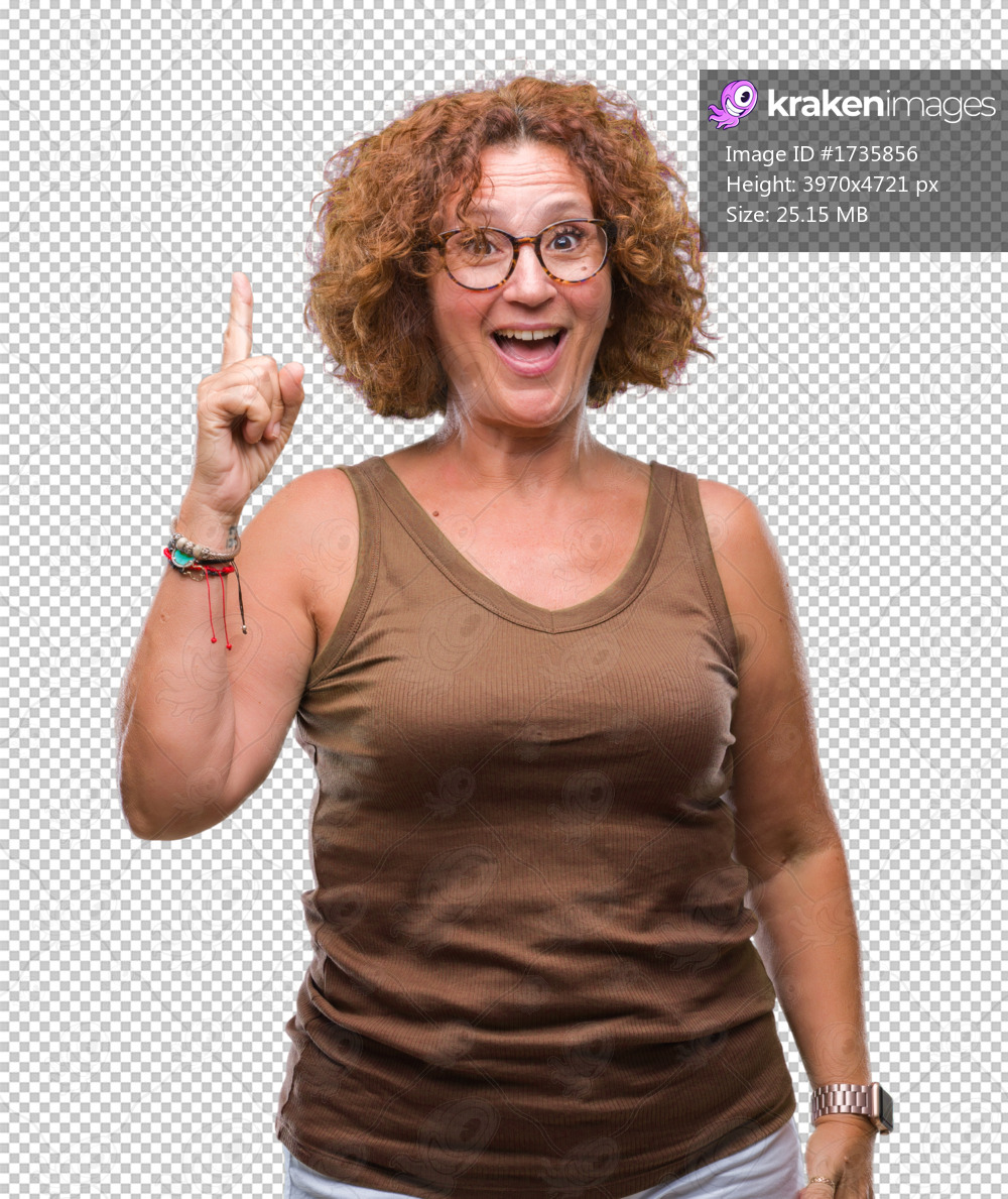 Middle age hispanic woman wearing glasses over isolated background pointing finger up with successful idea. Exited and happy. Number one.
