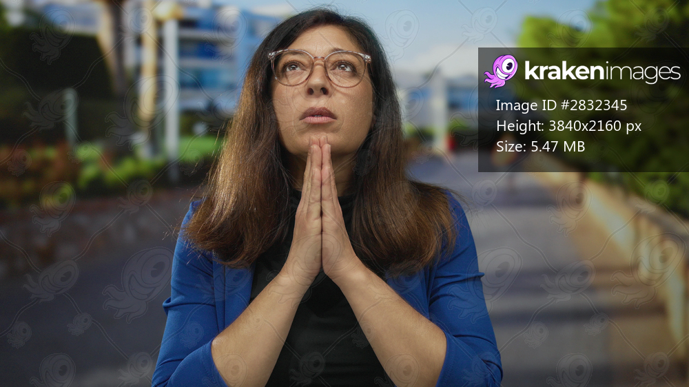 Middle age hispanic woman wearing glasses with palms pressed together in prayer gesture on street; serenity.