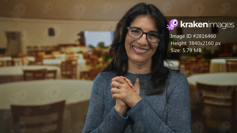 Middle age hispanic woman wearing glasses smiling with clasped hands at a table in restaurant dining room; prayer hope gratitude.