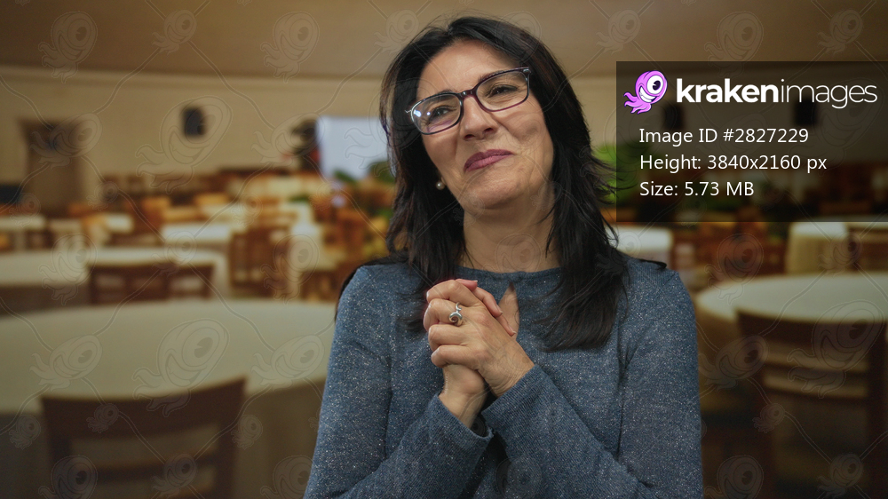 Middle age hispanic woman wearing glasses smiling with clasped hands at a table in restaurant dining room; prayer hope gratitude.