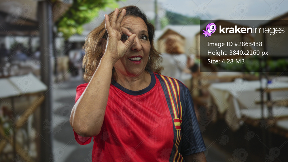 Middle age hispanic woman wearing red tshirt makes ok sign to eye on restaurant terrace; approval cheerful.