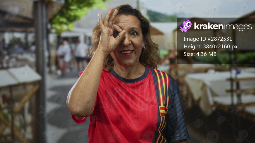 Middle age hispanic woman wearing red tshirt makes ok sign to eye on restaurant terrace; approval cheerful.