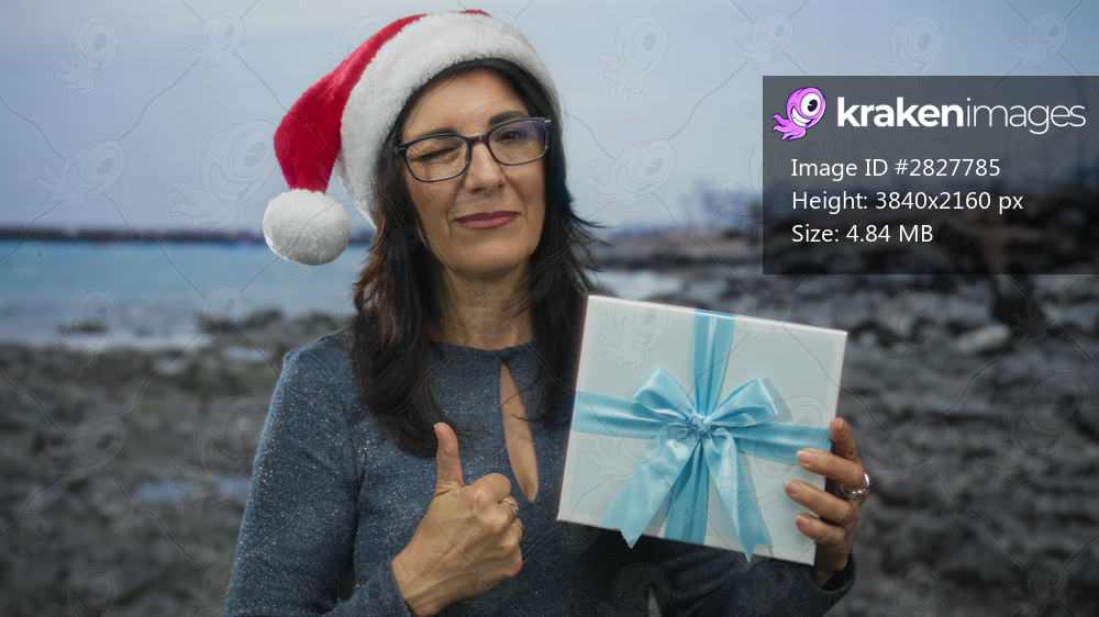 Middle age hispanic woman wearing santa hat and holding gift box with ribbon while giving thumb up on rocky seaside beach; holiday joy.