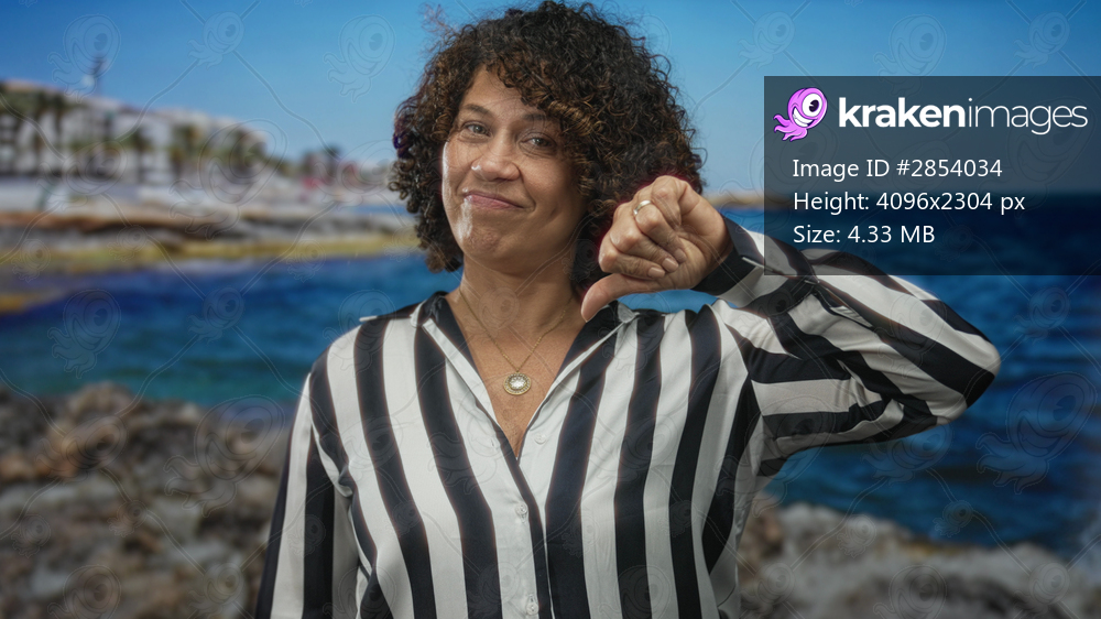 Middle age hispanic woman wearing striped blouse giving thumbs down gesture on beach under clear sky; disapproval.
