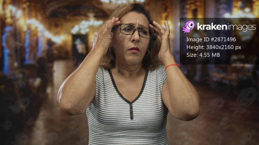 Middle age hispanic woman wearing striped shirt raises bare palms in museum building hall; confusion.
