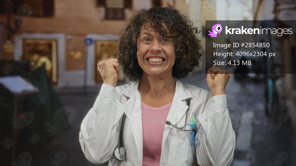 Middle age hispanic woman wearing white coat and stethoscope raises clenched fists on sunlit cobblestone street; excitement.