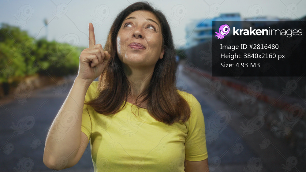 Middle age hispanic woman wearing yellow shirt pointing index finger upward on street beside stone wall in daylight; optimism.