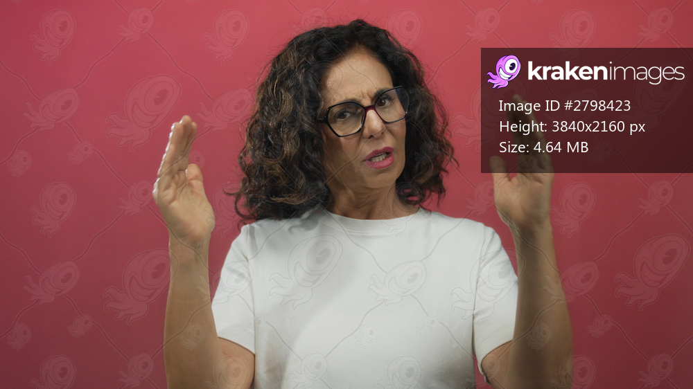 Middle age hispanic woman wears glasses and shows a wide hand gesture while speaking in a red studio; emphasis explanation assertiveness clarity.