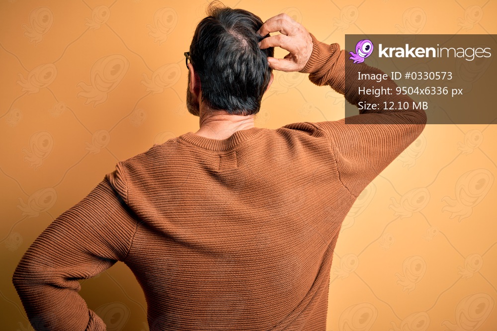 Middle age hoary man wearing brown sweater and glasses over isolated yellow background Backwards thinking about doubt with hand on head