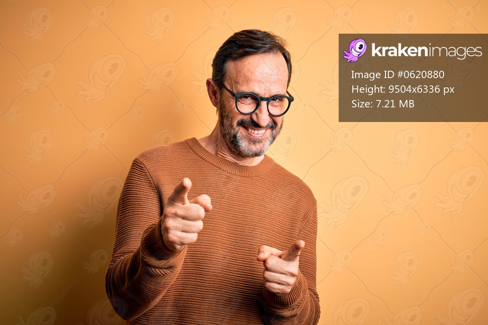 Middle age hoary man wearing brown sweater and glasses over isolated yellow background pointing fingers to camera with happy and funny face. Good energy and vibes. - Kraken Images