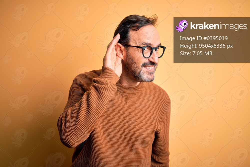 Middle age hoary man wearing brown sweater and glasses over isolated yellow background smiling with hand over ear listening an hearing to rumor or gossip. Deafness concept. - Kraken Images