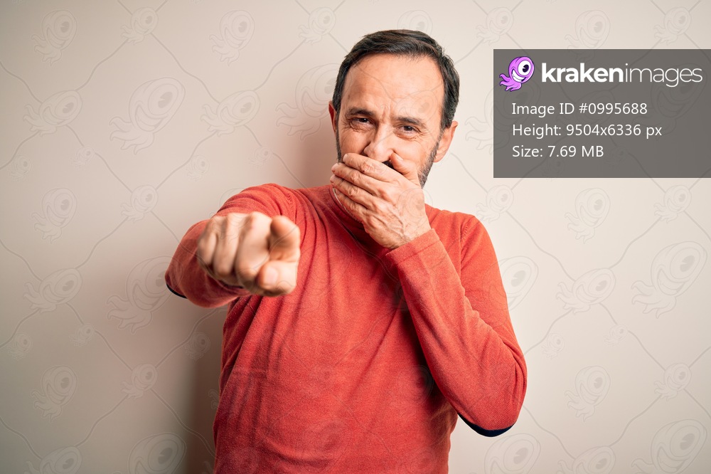 Middle age hoary man wearing casual orange sweater standing over isolated white background laughing at you, pointing finger to the camera with hand over mouth, shame expression - Kraken Images