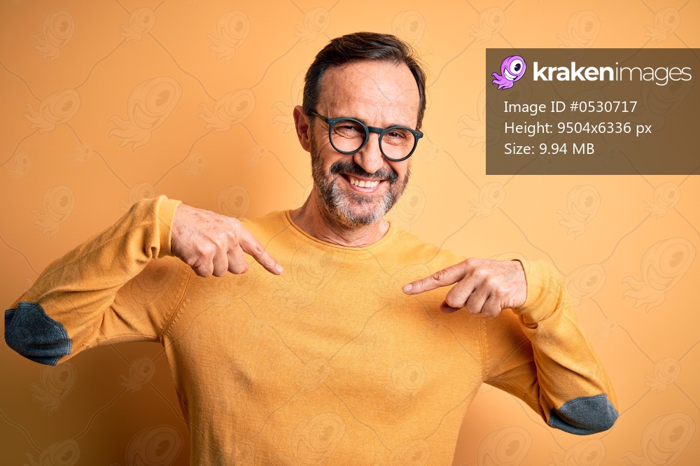 Middle age hoary man wearing casual sweater and glasses over isolated yellow background looking confident with smile on face, pointing oneself with fingers proud and happy. - Kraken Images