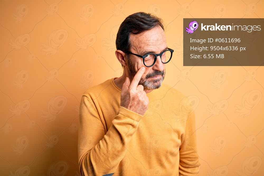 Middle age hoary man wearing casual sweater and glasses over isolated yellow background Pointing to the eye watching you gesture, suspicious expression - Kraken Images