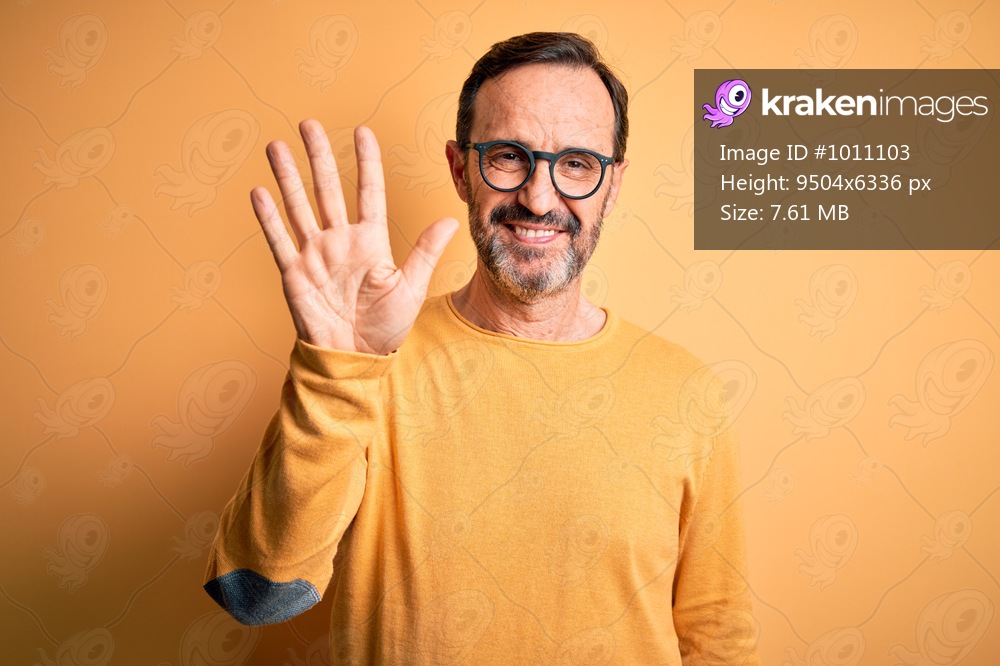 Middle age hoary man wearing casual sweater and glasses over isolated yellow background showing and pointing up with fingers number five while smiling confident and happy. - Kraken Images