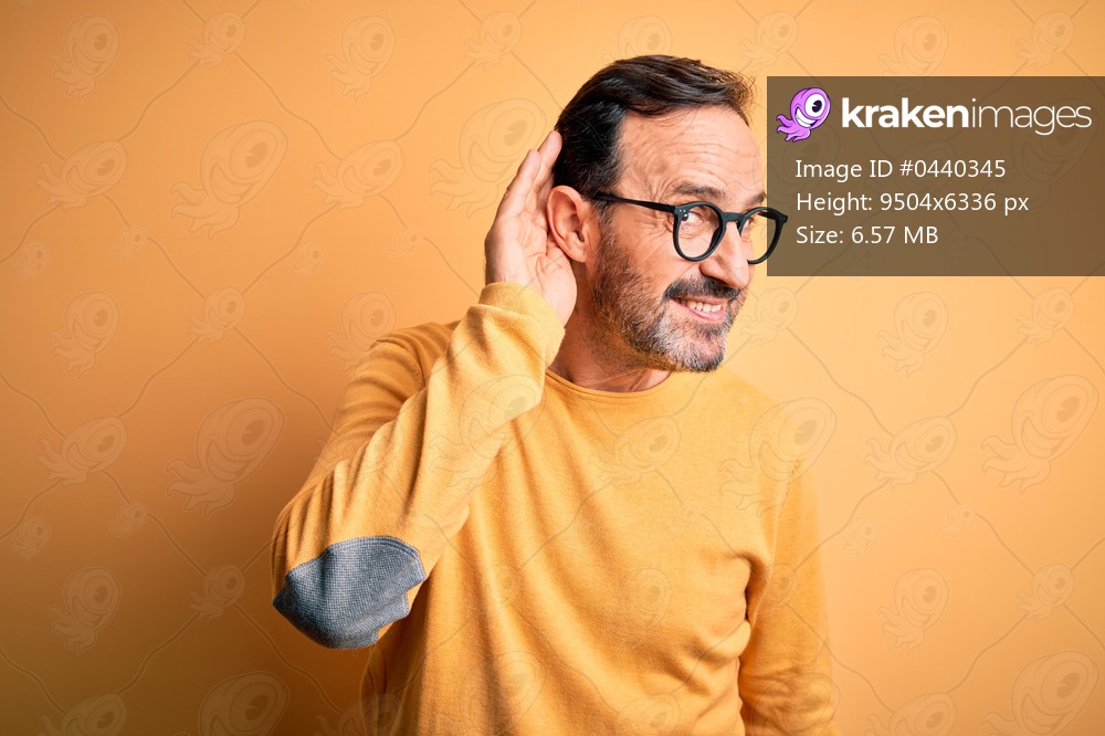 Middle age hoary man wearing casual sweater and glasses over isolated yellow background smiling with hand over ear listening an hearing to rumor or gossip. Deafness concept. - Kraken Images