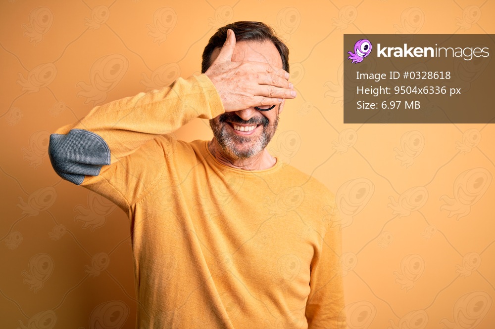 Middle age hoary man wearing casual sweater and glasses over isolated yellow background smiling and laughing with hand on face covering eyes for surprise. Blind concept. - Kraken Images