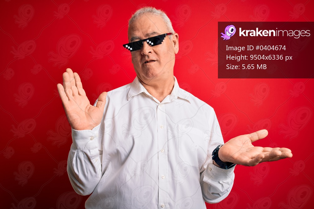 Middle age hoary man wearing funny sunglasses over isolated red background clueless and confused expression with arms and hands raised. Doubt concept.