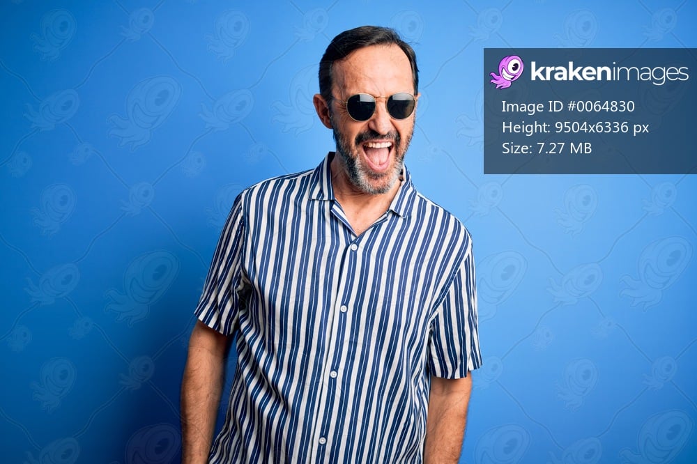 Middle age hoary man wearing striped shirt and sunglasses over isolated blue background winking looking at the camera with sexy expression, cheerful and happy face. - Kraken Images