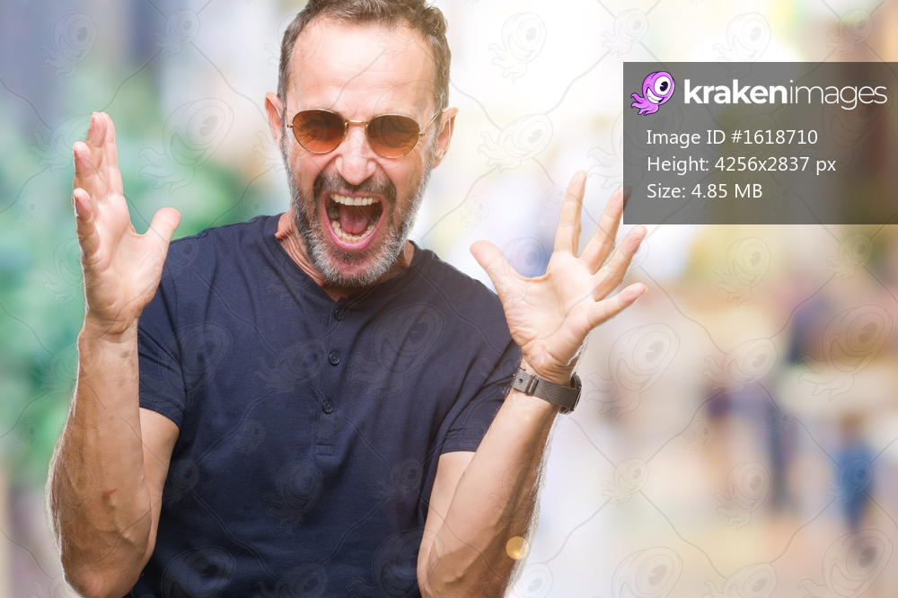 Middle age hoary senior man wearing sunglasses over isolated background celebrating crazy and amazed for success with arms raised and open eyes screaming excited. Winner concept - Kraken Images