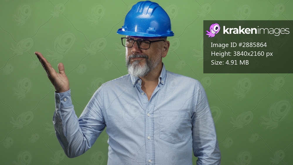 Middle age man with beard and glasses wearing blue hard hat holding open hand to the side in green studio; thoughtful planning.