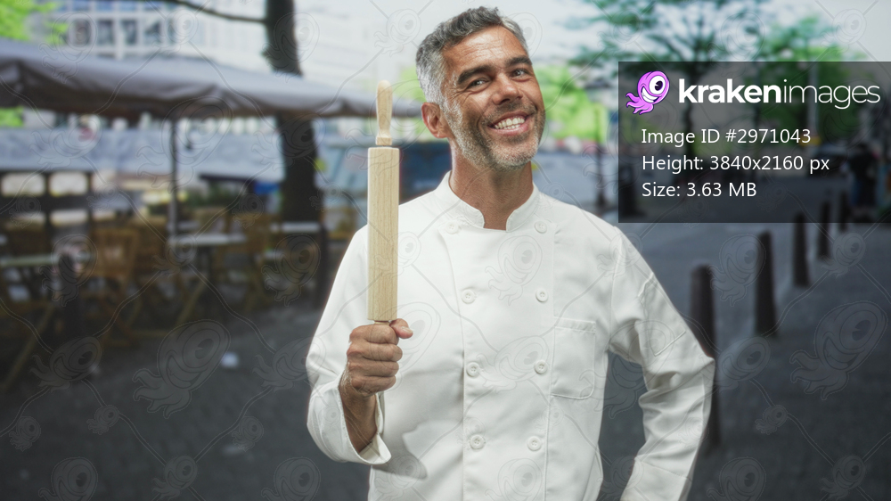 Middle age man chef with grey hair holding rolling pin and smiling on street outdoor cafe scene; pride baking craft.