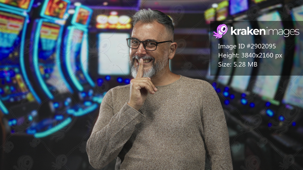 Middle age man with finger to lips for silence at casino slot machines wearing sweater and glasses; quiet secrecy.