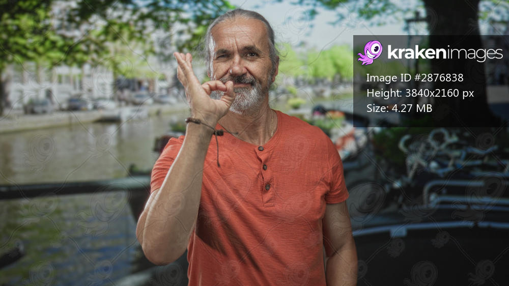 Middle age man giving thumbs up with hand on an amsterdam canal street by water and bicycles; optimism.
