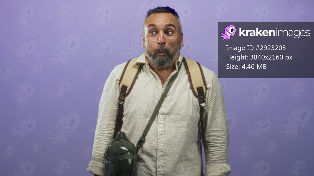 Middle age man with grey hair and beard wearing a backpack with hand covering mouth gesture in studio with purple backdrop; surprise adventure travel.