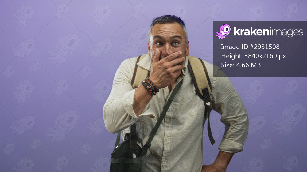 Middle age man with grey hair and beard wearing a backpack with hand covering mouth gesture in studio with purple backdrop; surprise adventure travel.