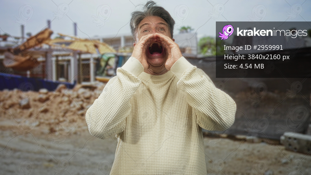 Middle age man with grey hair cups hands to mouth shouting beside a yellow excavator and piles of rubble at a building site; urgency warning.