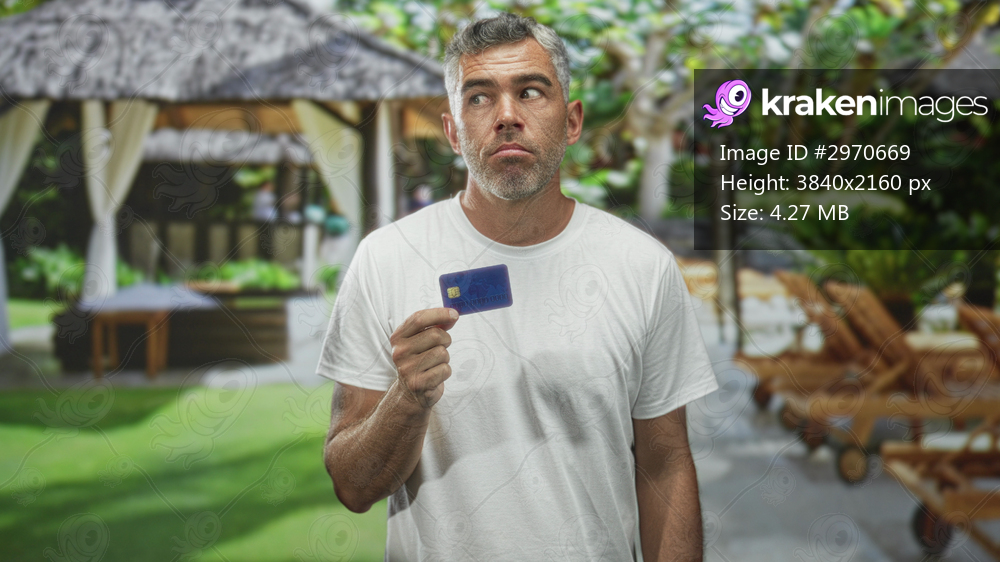 Middle age man with grey hair holding creditcard, looking up with puzzled face in resort building; financial worry uncertainty.