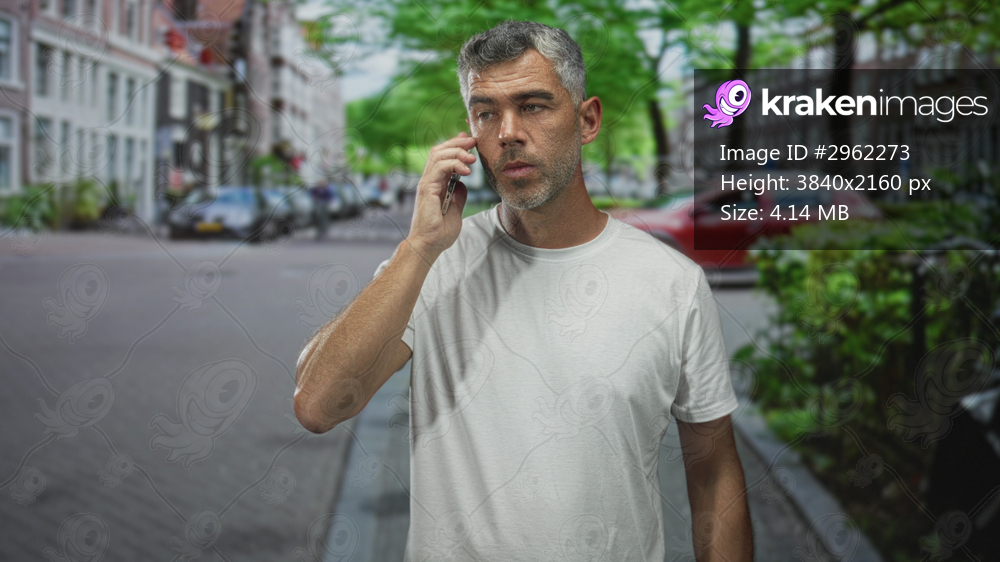 Middle age man with grey hair holds smartphone to ear on a cobbled city street, forearm exposed while talking into phone; concern waiting urgency.