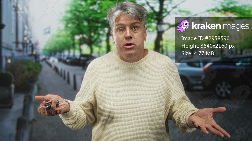Middle age man holding car keys and shrugging with palms up on an urban street with parked cars visible; confusion inconvenience.