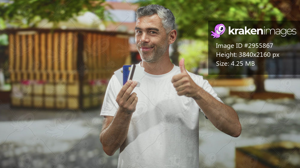 Middle age man holding creditcard and pinches fingers to show small amount in street market; financial debt concern.