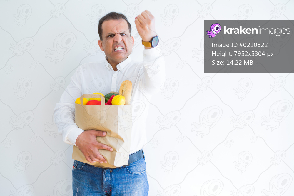 Middle age man holding groceries shopping bag over white background annoyed and frustrated shouting with anger, crazy and yelling with raised hand, anger concept - Kraken Images