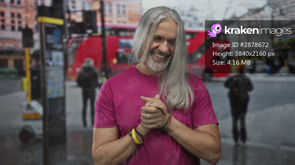 Middle age man with long gray hair and beard clasping hands near mouth, wearing pink shirt and bracelets in front of red bus on rainy city street; quiet contentment. - Kraken Images