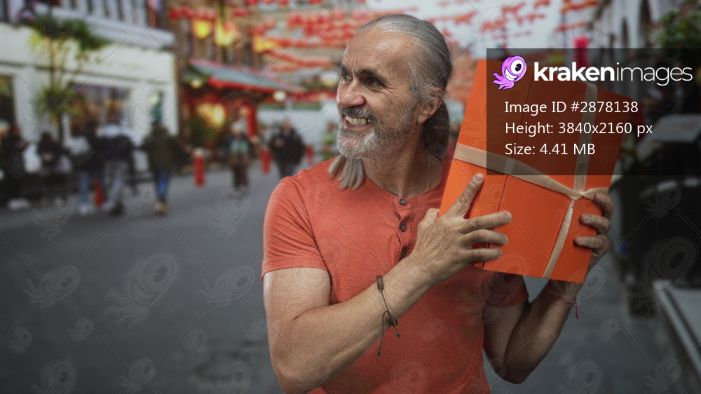 Middle age man with long gray hair holding a gift box on a busy street decorated with red lanterns and shoppers; warm happiness.