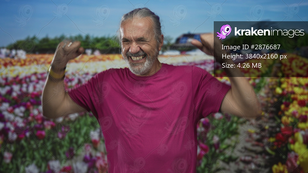 Middle age man with long grey hair smiling and fists raised in studio amid rows of colorful tulip flowers in a field; joy celebration.