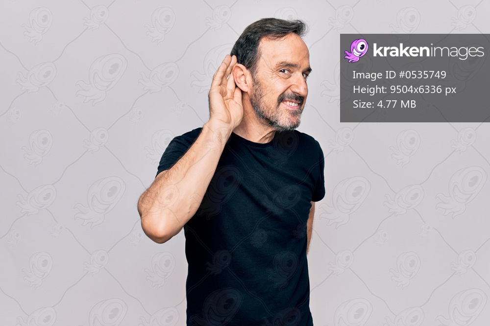 Middle age man wearing casual black t-shirt standing over isolated white background smiling with hand over ear listening and hearing to rumor or gossip. Deafness concept. - Kraken Images