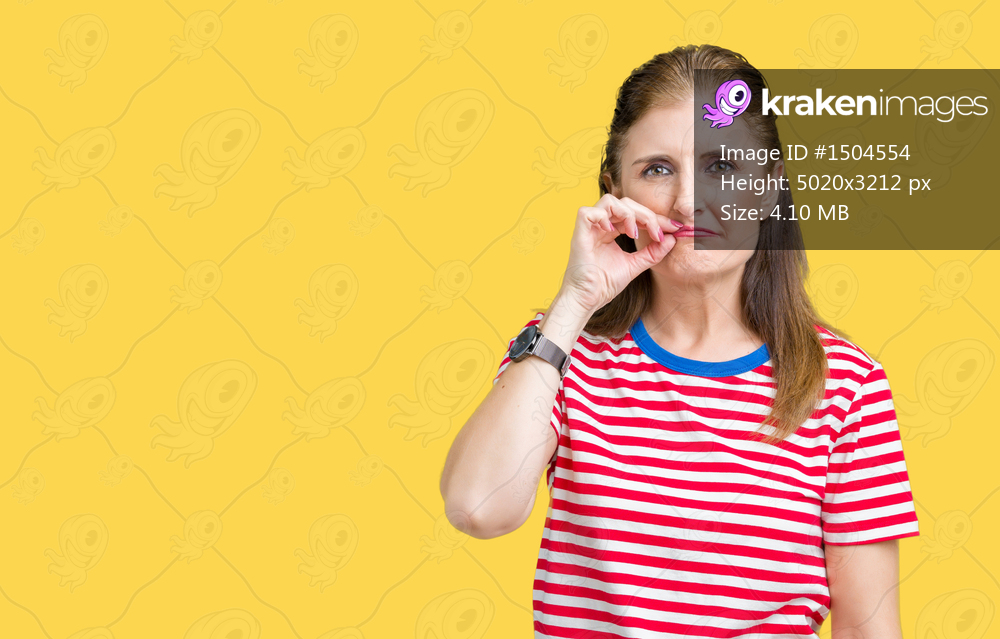Middle age mature woman wearing casual t-shirt over isolated background mouth and lips shut as zip with fingers. Secret and silent, taboo talking