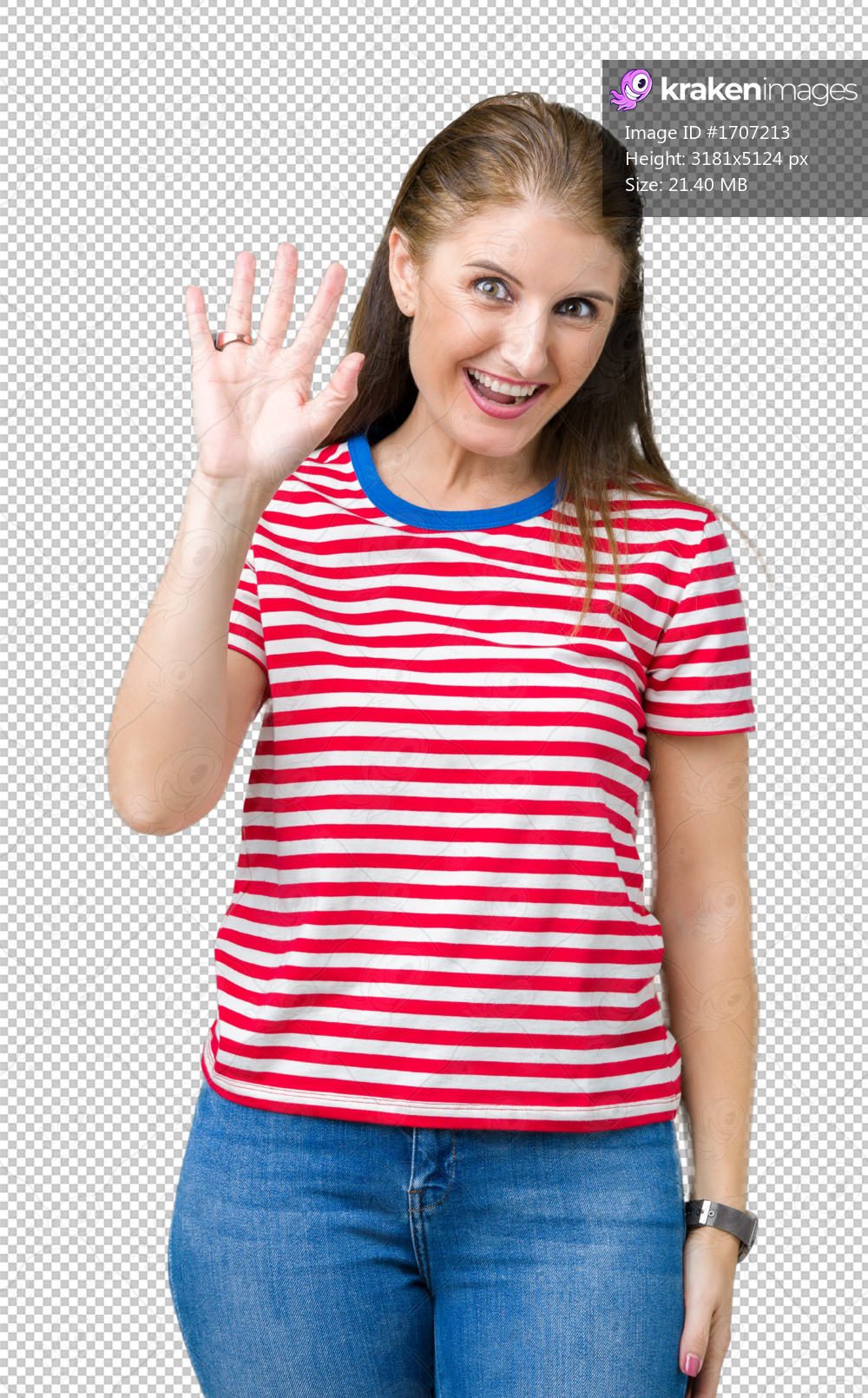 Middle age mature woman wearing casual t-shirt over isolated background Waiving saying hello happy and smiling, friendly welcome gesture