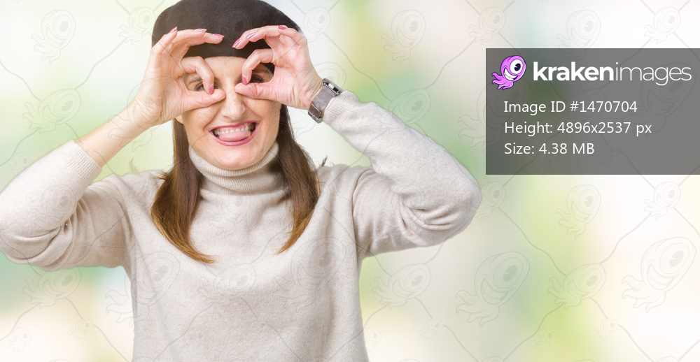 Middle age mature woman wearing winter sweater and beret over isolated background doing ok gesture like binoculars sticking tongue out, eyes looking through fingers. Crazy expression. - Kraken Images