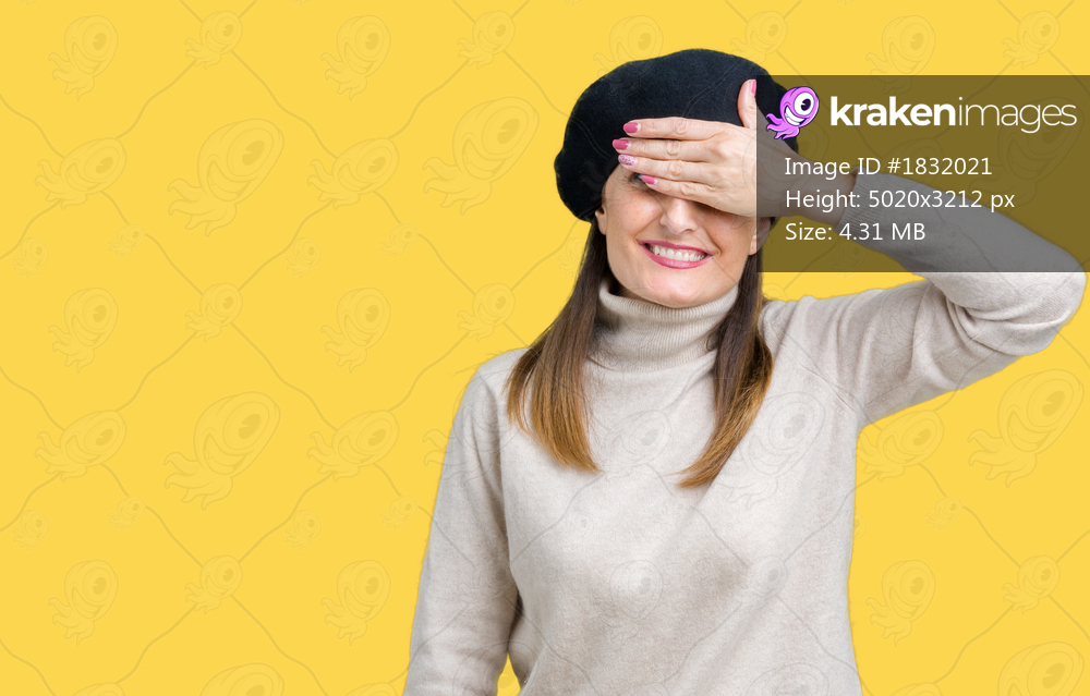 Middle age mature woman wearing winter sweater and beret over isolated background smiling and laughing with hand on face covering eyes for surprise. Blind concept. - Kraken Images